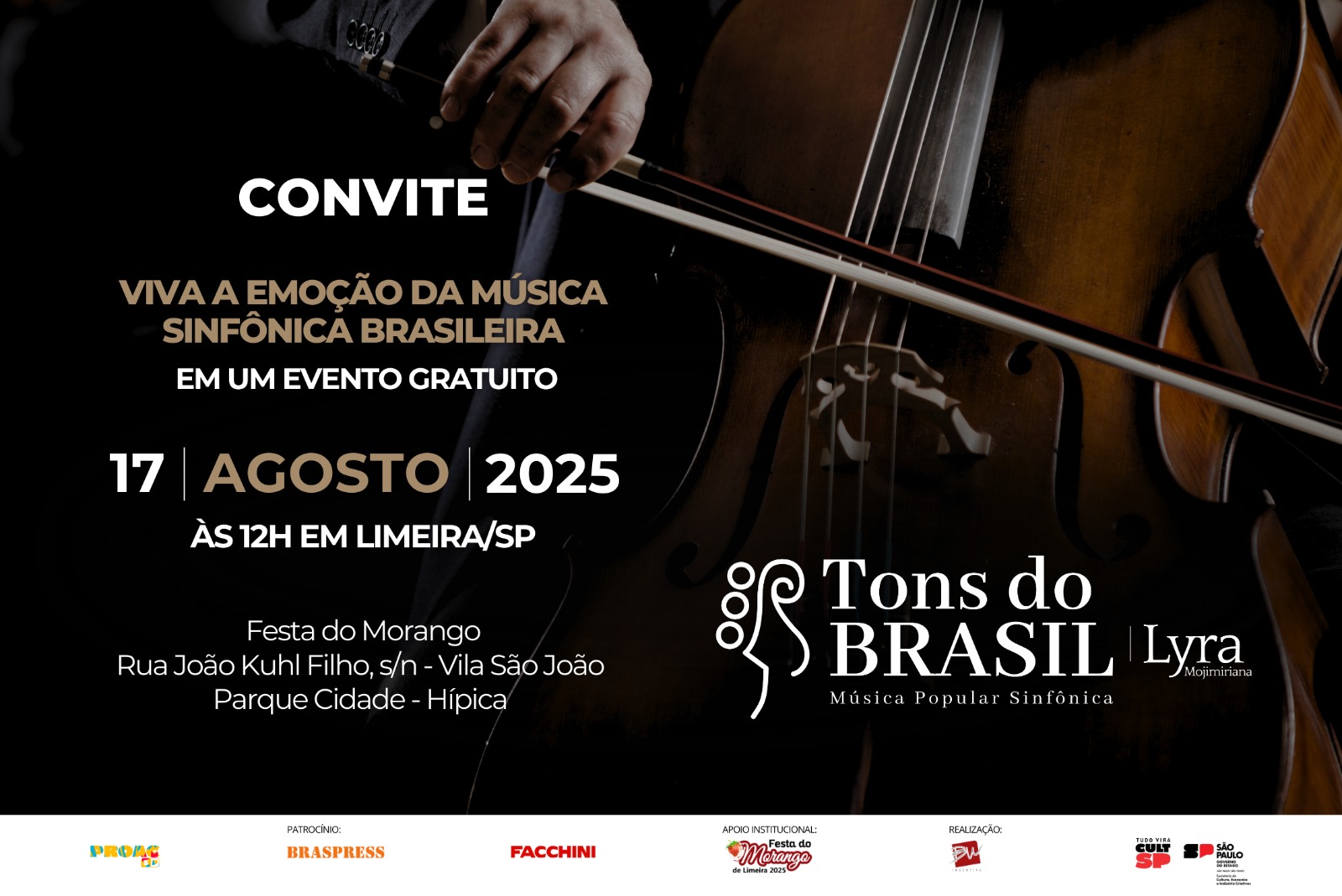 O concerto trará versões sinfônicas inéditas de grandes sucessos da música brasileira, emocionando o público com um repertório que vai de samba a bossa nova, passando por pop rock e muito mais. A apresentação será às 12h, no Parque Cidade – Hípica, localizado na Rua João Kuhl Filho, s/n – Vila São João, como parte da tradicional Festa do Morango, com entrada gratuita.