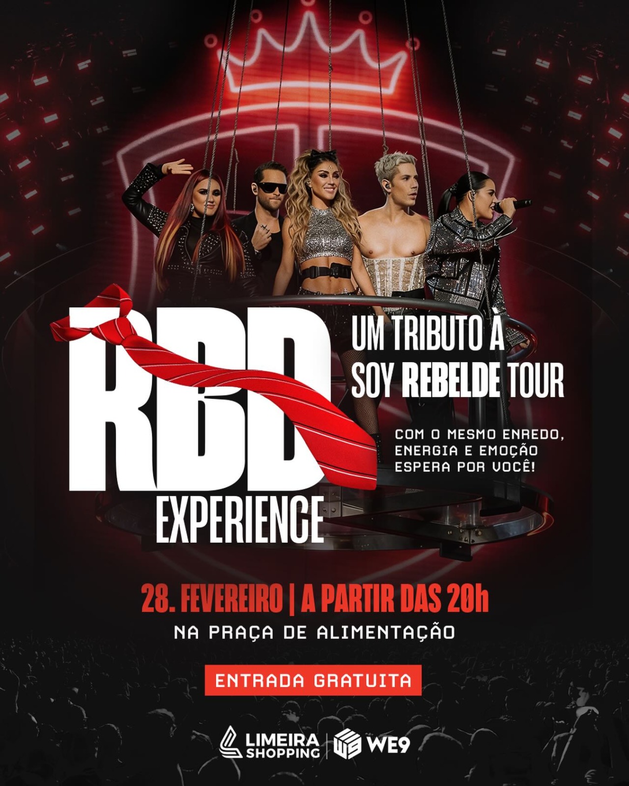 Inspirado por esse fenômeno que atravessa gerações, o Limeira Shopping realiza, no dia 28 de fevereiro, a partir das 20h, o espetáculo “Tributo ao RBD Experience”, que remete a turnê Soy Rebelde Tour.